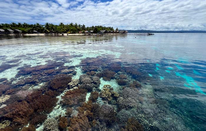 Dampier Strait and Batanta views from private beach bungalows on the southern shore of Pulau Arborek. Diving, mantas and village life all close at hand.