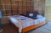 Four of the five bungalows sleep two people on raised beds. (In June 2025, the fifth bungalow still has a mattress on the floor.) Sheets, pillows, bolsters and mosquito nets are supplied in all bungalows. An extra mattress for a third guest can be provided if required.