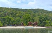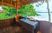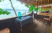 The bungalows sit on the white sands of the Kri north coast beach. They are shaded by overhanging trees and have ocean views to Gam and Waigeo. Each bungalow has a covered verandah with chairs and a table.