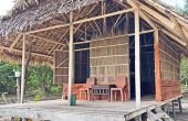 The bungalow sleeps two on a mattress on the floor. Bedding includes sheets, pillows, bolsters and mosquito nets. Power outlets are provided, and the bungalow verandahs have table and chair settings.