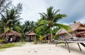 Two bungalows sit on the beach. Two land bungalows are set back in the shade of coconut palms, but still enjoy sea views.