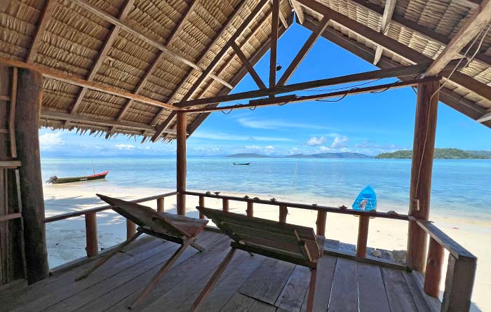 Expansive ocean and sunset views from beach bungalows on Pulau Friwen’s western shore. Friwen Wall, Friwen Beach, and village are all nearby.